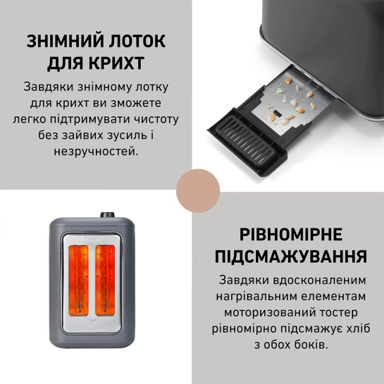 Зручний лоток для крихт, розташований за тостером, легко знімається для очищення. Це практичне рішення допоможе надовго зберегти ваш тостер у відмінному стані.