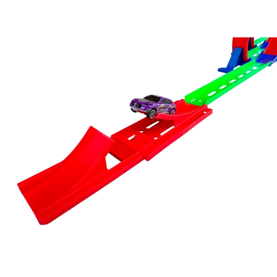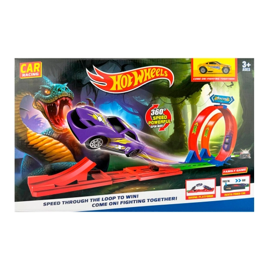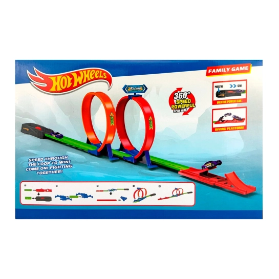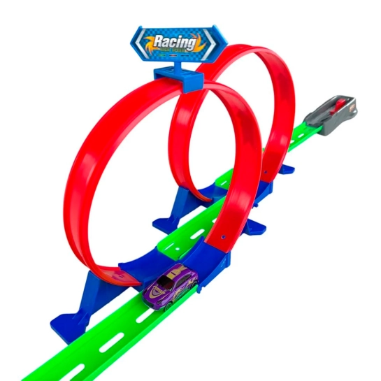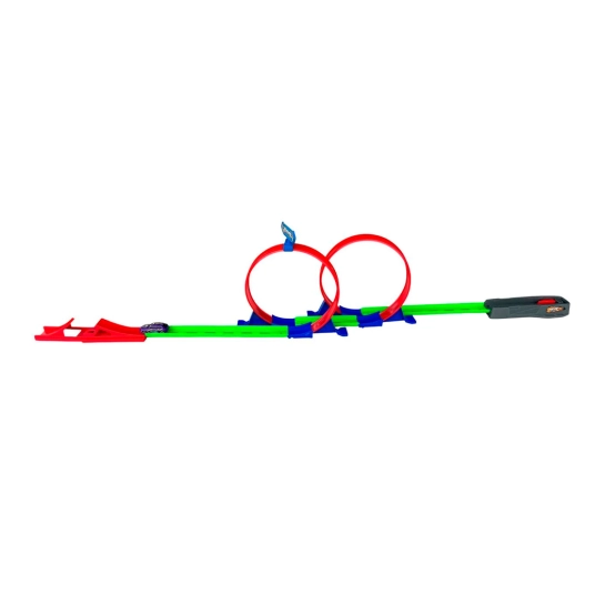 Драйвовий автотрек із двома мертвими петлями для справжніх фанатів швидкості! Завдяки пусковому механізму машина набирає шалену швидкість і проходить обидві петлі, фінішуючи на ефектному трампліні. Яскравий дизайн та динаміка гри гарантовано захоплять дитину з першого запуску!