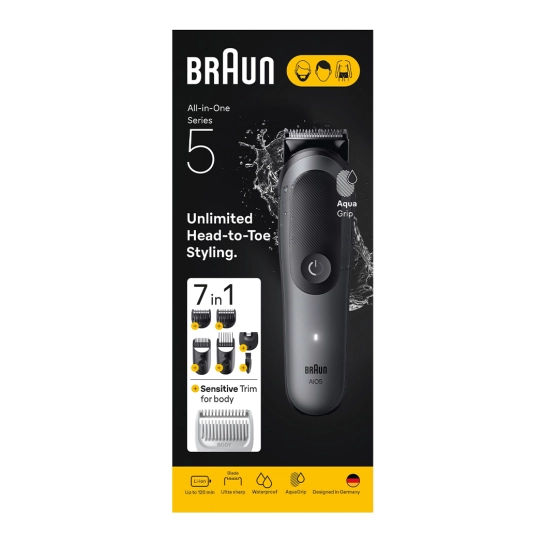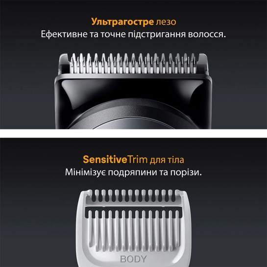 Універсальний набір для догляду All-in-One від Braun для чоловіків. Комплект інструментів 7-в-1 дозволяє легко підстригати бороду, волосся на вухах і в носі, підстригати волосся і доглядати за всім тілом. Легко досягайте точності та ефективності з неймовірно гострим лезом". SensitiveTrim. 14 налаштувань довжини та технологія AquaGrip для використання під водою забезпечують повний контроль над доглядом за собою.
