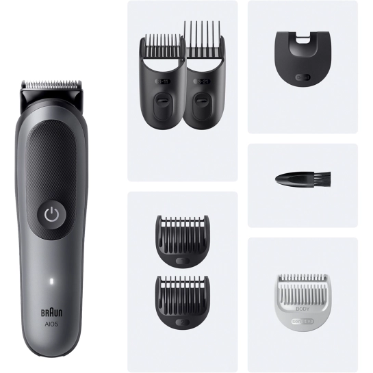 Комплект 7-в-1 від Braun для догляду All-in-One містить ретельно підібрані інструменти для підстригання бороди, стрижки волосся та догляду для чоловіків.