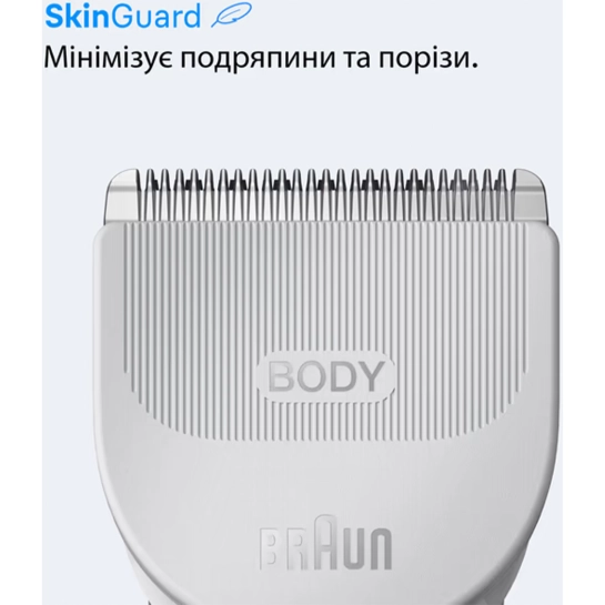 Система SkinGuard розроблена для мінімізації ризику порізів та подразнень. Вона дбайливо спрямовує леза, забезпечуючи м'яке ковзання по шкірі. Це робить триммер безпечним для щоденного використання, навіть у важкодоступних чи чутливих місцях.