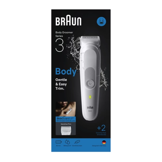 Чоловічий тример для тіла Braun Series 3 створений для тих, хто цінує акуратність, комфорт та впевненість у собі. Він забезпечує дбайливу стрижку навіть у найчутливіших зонах, дозволяючи досягти чистого та акуратного результату без зайвих зусиль. Зручна форма пристрою ідеально лягає в руку – для точного контролю та легкого руху.