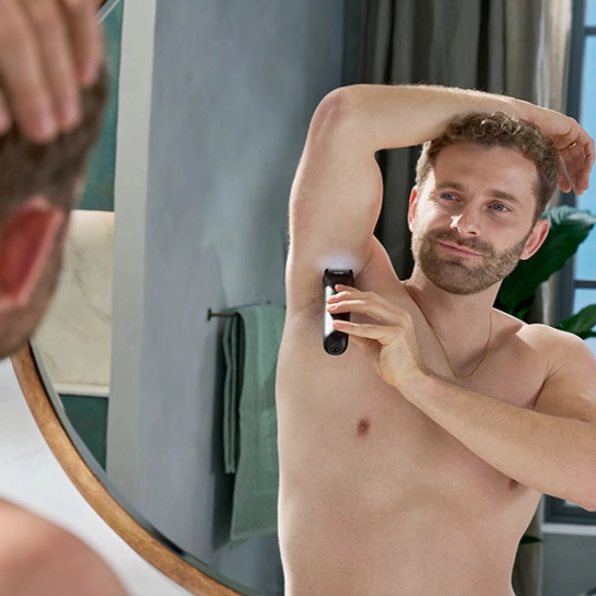 Philips Bodygroom 7000 оснащений інноваційною системою з двома незалежними головками, які працюють у тандемі. Одна забезпечує ретельне гоління для м’якої шкіри, інша — рівномірне підстригання волосся, щоб підкреслити ваш унікальний стиль. Ви можете легко перемикатися між функціями, створюючи ідеально доглянуте тіло без необхідності використовувати кілька приладів.