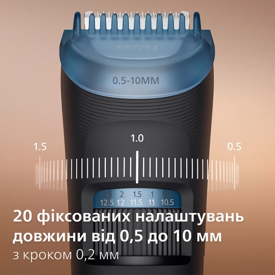 Регулятор тримера дозволяє вибрати одну з 20 доступних установок довжини кроком 0,5 мм, щоб ви могли оформити свою бороду саме так, як хочете.
