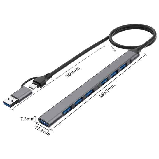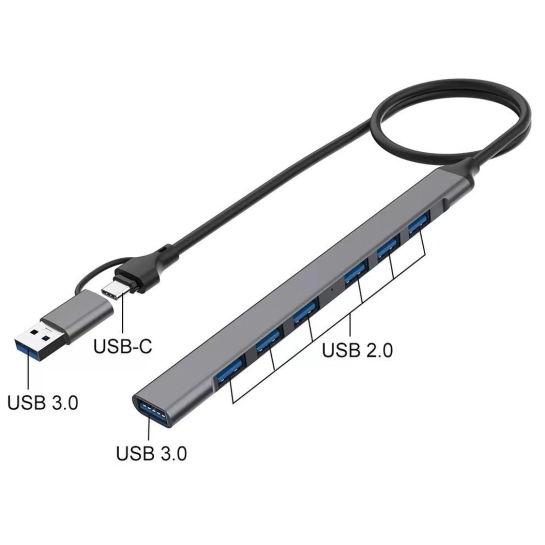 Концентратор оснащений сімома USB-портами, включаючи шість портів USB 2.0 та один високошвидкісний порт USB 3.0, що забезпечує оптимальний баланс між кількістю підключень та продуктивністю. Порт USB 3.0 призначений для підключення пристроїв, які вимагають високої швидкості передачі даних, таких як зовнішні жорсткі диски, SSD-накопичувачі або професійні USB-пристрої, забезпечуючи швидкість передачі, значно вищу за можливості USB 2.0. Шість портів USB 2.0 ідеально підходять для підключення стандартної периферії: клавіатур, мишей, принтерів, веб-камер, USB-флешок та інших повсякденних пристроїв, які не вимагають максимальної пропускної здатності. Така конфігурація дозволяє ефективно організувати робочий простір, підключивши всі необхідні пристрої через один концентратор.
