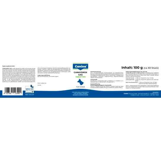 CANINA® CANHYDROX GAG був спеціально розроблений для великих та важких порід собак. Він забезпечує високоякісне харчування сполучної тканини, суглобів, кісток, сухожиль, зв'язок, хрящів та зубів. Молоді собаки, а також собаки, що працюють і старіють, отримують користь від цього «універсального» продукту для опорно-рухового апарату!