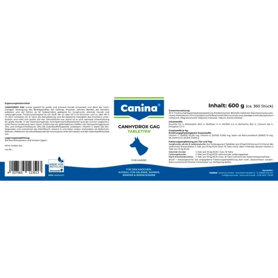 CANINA CANHYDROX GAG був спеціально розроблений для великих та важких порід собак. Він забезпечує високоякісне харчування сполучної тканини, суглобів, кісток, сухожиль, зв'язок, хрящів та зубів. Молоді собаки, а також собаки, що працюють і старіють, отримують користь від цього «універсального» продукту для опорно-рухового апарату!