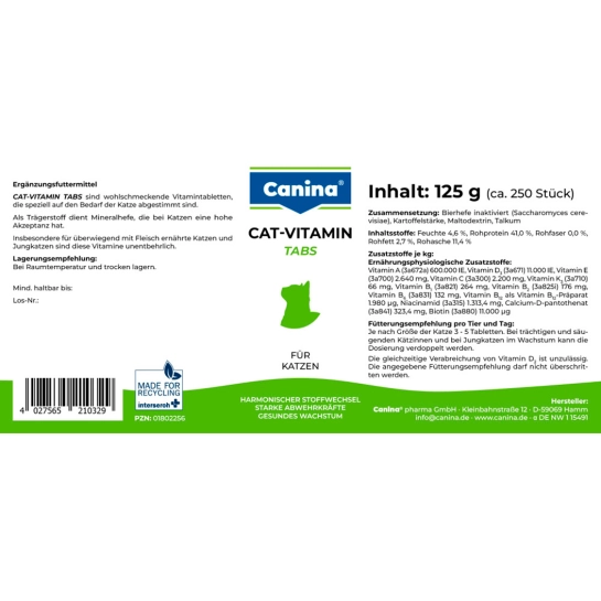 Характеристики для Вітаміни Canina Cat-Vitamin Tabs для кішок, вітамінний комплекс, 125 г (250 табл) (210329 AD)