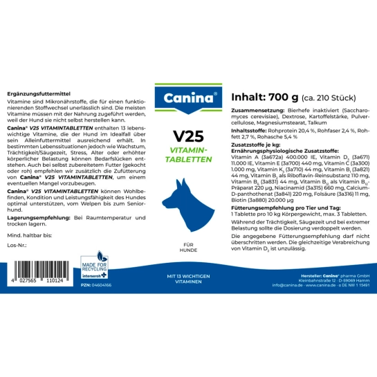 Характеристики для Вітаміни Canina V25 Vitamintabletten для собак, полівітамінний комплекс, 700 г (210 табл) (110124 AD)