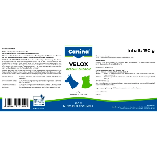 CANINA® VELOX GELENKENERGIE забезпечує опорно-руховий апарат високоякісними глікозаміногліканами (ГАГ), що містяться в зеленогубій мідії (Perna canaliculus) з Нової Зеландії. ГАГ, такі як хондроїтин сульфат, гепаран сульфат та гіалуронова кислота, стабілізують і регенерують структури сполучної тканини, такі як сухожилля, зв'язки, суглобовий хрящ та міжхребцеві диски. Працездатність вашого вихованця підвищується, а його самопочуття покращується.