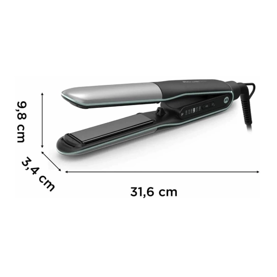 Пластини з покриттям титану забезпечують ідеальне ковзання, а металевий корпус і округлий дизайн дозволяють легко випрямляти волосся або створювати пружні локони. Завдяки високій теплопровідності зачіска тримається довше, зберігаючи форму та блиск до 48 годин.