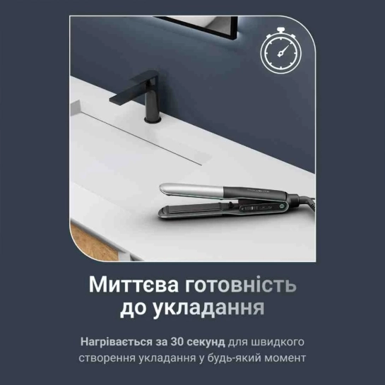 Готовий до використання лише за 30 секунд – ідеальне рішення для динамічних ранків, коли кожна секунда є важливою. Швидке нагрівання дозволяє миттєво створювати гладке випрямлення або бездоганне укладання, щоб ви завжди виглядали неперевершено.