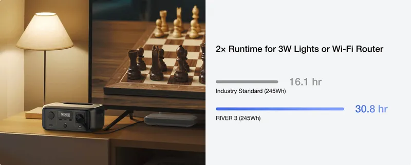 RIVER 3 революціонізує енергоефективність, забезпечуючи вдвічі більший час роботи для приладів потужністю до 100 Вт, що розширює можливості використання вдома та на природі.