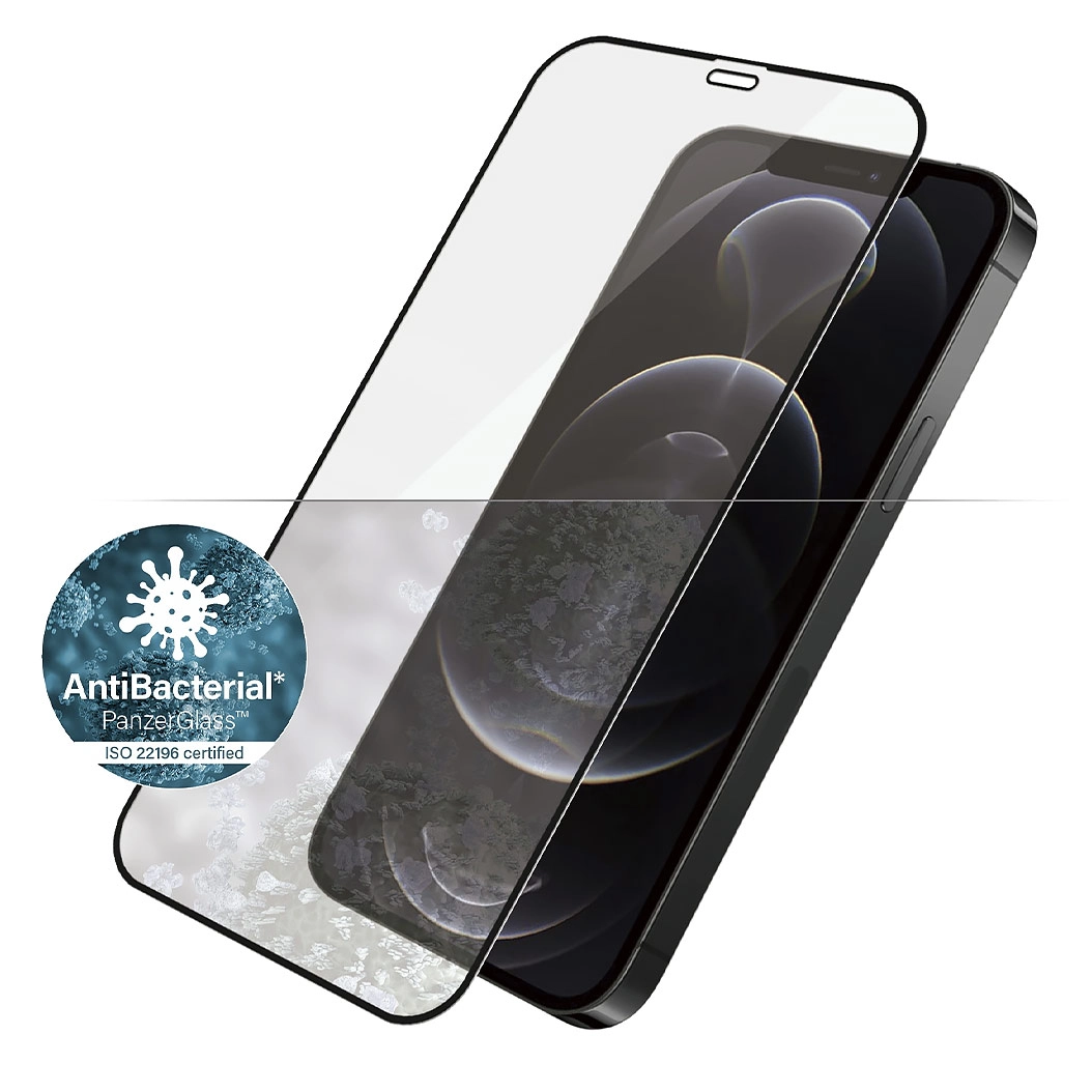 Захисне скло PanzerGlass чорного кольору для iPhone 12/12 Pro з антибактеріальним покриттям захистить ваш екран від подряпин та ударів.