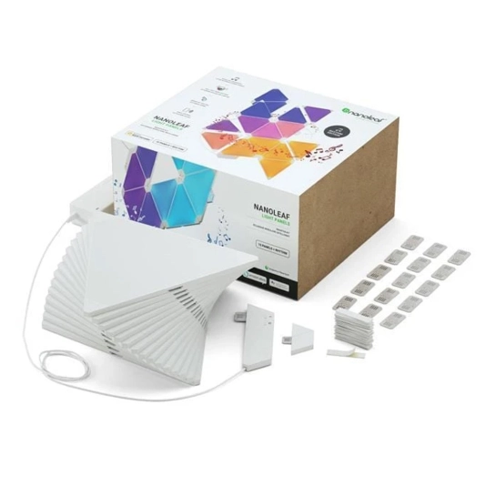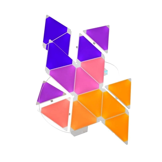RGBW-панели для умного светильника Nanoleaf Light Panels выполнены в форме треугольников. Соединяются они при помощи специальных коннекторов, позволяющих использовать любую грань. Такое соединение дает возможность выстраивать 2D-фигуры любой сложности. Комплект может быть расширен дополнительными LED-панелями.