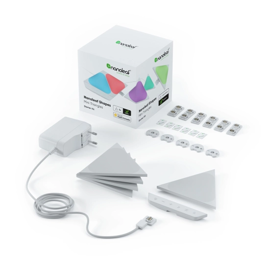 RGBW-панели для умного светильника Nanoleaf Shapes Triangles выполнены в форме треугольников. Соединяются они при помощи специальных коннекторов, позволяющих использовать любую грань. Такое соединение дает возможность выстраивать 2D-фигуры любой сложности. Комплект может быть расширен дополнительными LED-панелями. Один блок питания способен обеспечить функциональность 77 панелей, а модуль управления рассчитан для 500 панелей.