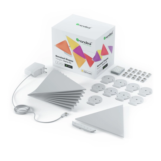 RGBW-панели для умного светильника Nanoleaf Shapes Triangles выполнены в форме треугольников. Соединяются они при помощи специальных коннекторов, позволяющих использовать любую грань. Такое соединение дает возможность выстраивать 2D-фигуры любой сложности. Комплект может быть расширен дополнительными LED-панелями. Один блок питания способен обеспечить функциональность 28 панелей, а модуль управления рассчитан для 500 панелей.