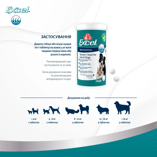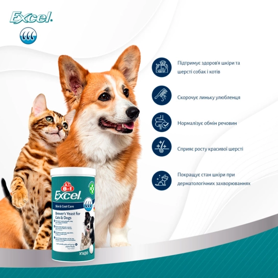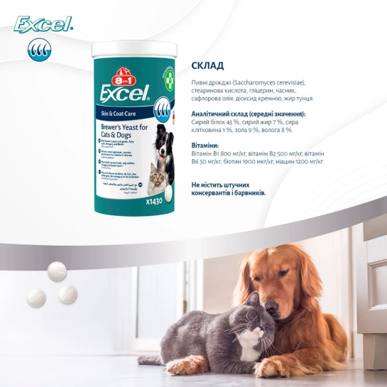 Характеристики для Витамины 8in1 Excel Brewers Yeast для собак и кошек, пивные дрожжи с чесноком, для кожи и шерсти, 1430 шт (661833)