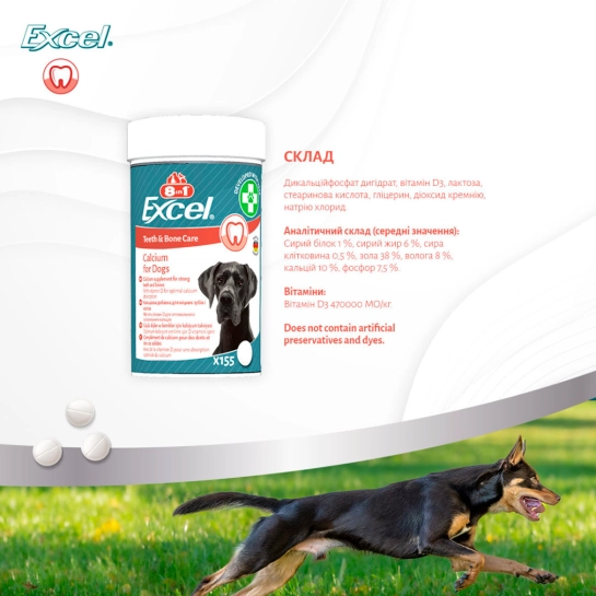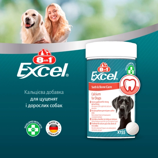Характеристики для Витамины 8in1 Excel Calcium для щенков и взрослых собак, для зубов и костей, кальций, 155 шт (661826)