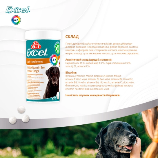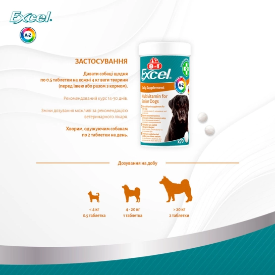 Характеристики для Витамины 8in1 Excel Multi Vitamin Senior для собак пожилого возраста, мультивитамин, 70 шт (661822)
