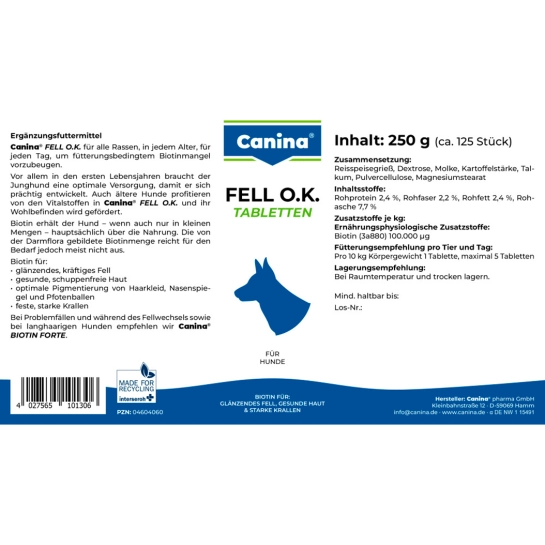 CANINA® FELL O.K. ТАБЛЕТКИ для собак всех пород всех возрастов для ежедневного применения для профилактики дефицита биотина, связанного с питанием.
