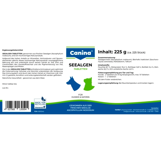 CANINA ТАБЛЕТКИ С МОРСКИМИ ВОДОРОСЛЯМИ являются частью ежедневного рациона, независимо от того, чем вы кормите любимца.