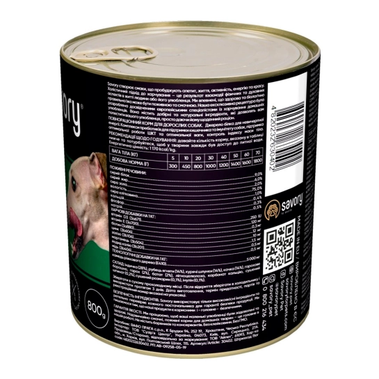 Характеристики для Влажный корм Savory для взрослых собак всех пород, с четырьмя видами мяса, 800 г (30402)