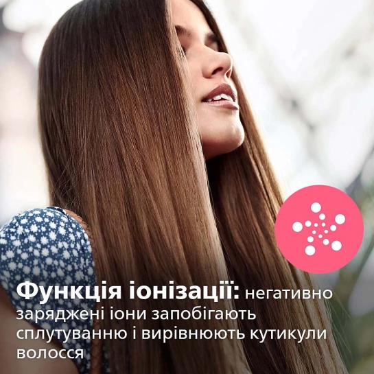 Отрицательно заряженные ионы позволяют снять статическое электричество и улучшить общее состояние волос, а также способствуют закрытию волосяных чешуек, что придает волосам дополнительный блеск. В результате ваши волосы гладкие, сияющие и шелковистые.