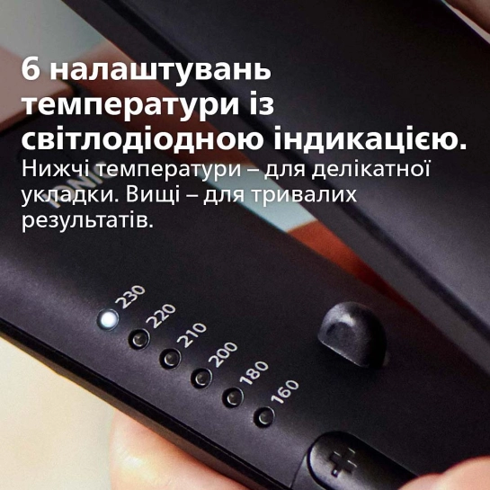 Регулировка температуры от 160 до 230 °C с четкой LED-индикацией для точного управления. Более низкие температуры для завершающих штрихов и бережной укладки. Высокие температуры для стойкого результата. Наслаждайтесь идеальной укладкой без повреждения волос.