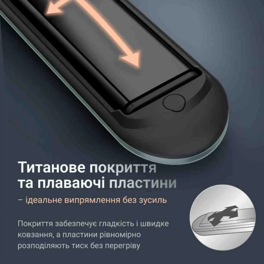 Титановое покрытие обеспечивает гладкость и быстрое скольжение, а плавающие пластины равномерно распределяют давление для эффективного выпрямления без перегрева.