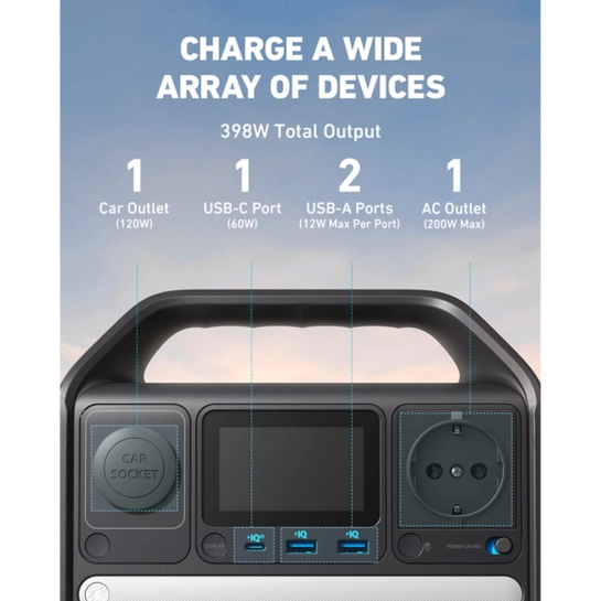 Электростанция имеет все порты, необходимые для зарядки ваших устройств и приборов в выходные, включая порт переменного тока, 2 порта USB-A, порт USB-C и автомобильную розетку.