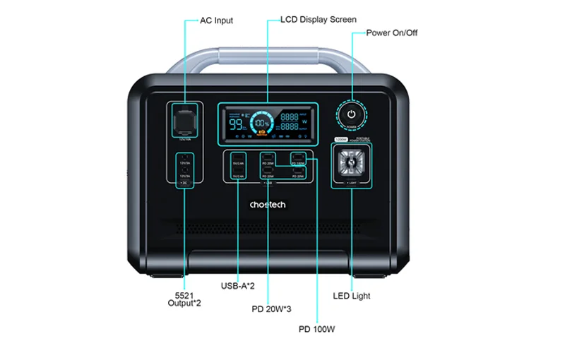 Поднимаетесь ли вы на гору, путешествуете на автофургоне или разбиваете палатку на открытом воздухе, электростанция Choetech мощностью 1200 Втч обеспечит питание ваших электронных устройств. Оснащен входом/выходом переменного тока, входом/выходом постоянного тока, тремя портами PD мощностью 20 Вт, одним портом мощностью 100 Вт. Порт PD, два порта USB-A 5 В/2,4 А, ЖК-дисплей и три режима освещения — эта электростанция пригодится на открытом воздухе или во время перебоев в подаче электроэнергии.