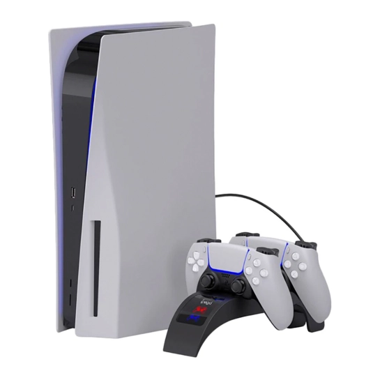 Благодаря специально выделенным позициям для контроллеров процесс зарядки становится максимально простым и комфортным: контроллеры легко устанавливаются и надежно фиксируются для безопасной зарядки. Индикаторы зарядки четко показывают текущий статус каждого контроллера, позволяя с первого взгляда определить, когда геймпады готовы к использованию. Встроенный повышающий регулятор постоянного тока обеспечивает стабильную и бесперебойную зарядку с напряжением 5 В и током до 850 мА на каждый контроллер, что гарантирует быстрое и эффективное восстановление заряда. Корпус зарядного устройства выполнен из прочного ABS пластика черного цвета, что обеспечивает его долговечность и стильный вид, гармонично сочетаясь с дизайном PS5.