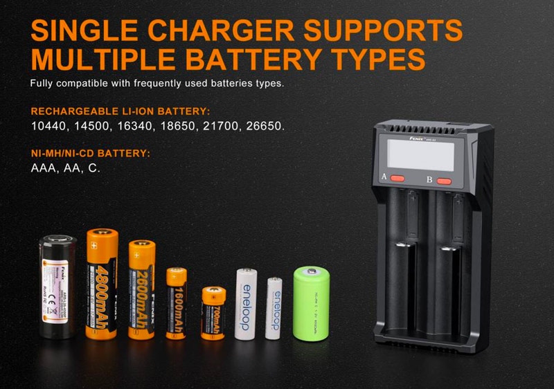 Модель Fenix ARE-D2 является по-настоящему универсальной. Она подходит для использования повседневно дома или в любых поездках. Заряжает это устройство 9 типов элементов питания. Подходящими являются аккумуляторы с литий-ионным электролитом размеров 10040, 18650, 21700, 14500, 16340, 26650, а также никель-кадмиевым и никель-металлгидридным - размеров ААА, АА, С.