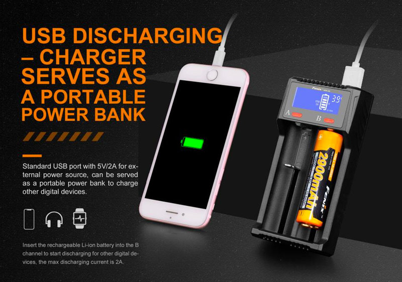Одновременно можно подзарядить 2 элемента питания любого типа. Каждый из 2 слотов Fenix ARE-D2 работает независимо от другого. При этом, F самостоятельно определит, какой именно аккумулятор установлен в слот, и какая программа зарядки для него подойдет. Пользователь же в течение 8 секунд после подключения зарядного устройства к питанию может выбрать силу тока для зарядки. Для элементов питания Li-ion типа это 0,5А, 1А или 2А. Другим аккумуляторам доступно 2 варианта: 0,5А или 1А.