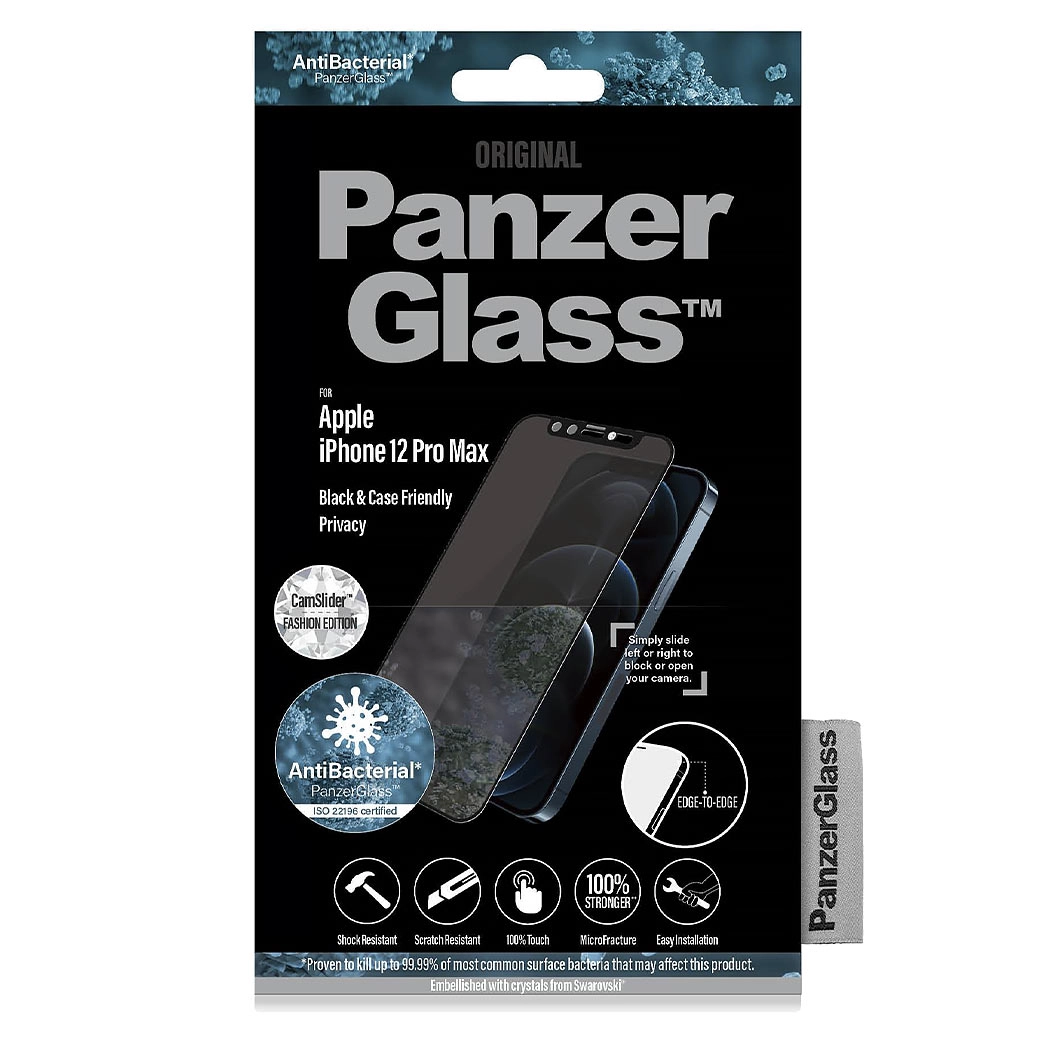 PanzerGlass CamSlider Fashion Edition, украшенный кристаллами Swarovski для Apple iPhone 12 Pro Max в черном цвете, оснащен первой и единственной в мире защитной пленкой Dual Privacy с встроенной крышкой для камеры, чтобы удовлетворить все ваши потребности в конфиденциальности в одном высококачественном продукте. Фильтр конфиденциальности делает содержимое дисплея почти невидимым для всех, кроме пользователя устройства.